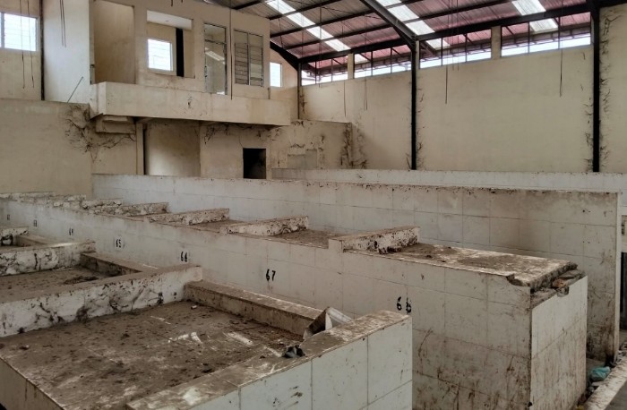 Pantauan Sinata.id, Sabtu 27 September 2025, ratusan petakan lapak dagangan berupa bangunan permanen dengan lapisan keramik di permukaan, penuh dengan debu. Tidak sedikit pula yang tampak rusak. Aliran listrik, juga sudah tak lagi ada di sana.