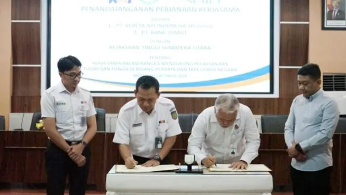 Penandatanganan kerja sama tersebut berlangsung di Kantor Kejati Sumut, Medan, Kamis (23/10/2025), oleh Vice President KAI Divre I Sumut Sofan Hidayah dan Kepala Kejati Sumut Harli Siregar.