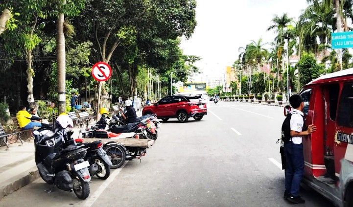 Namun di kawasan dilarang berhenti itu, sejumlah kendaraan roda dua (sepeda motor), tampak parkir. Terlihat juga juru parkir (jukir) melakukan kutipan biaya retribusi parkir di sana.