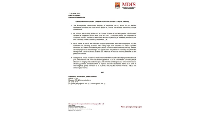 Jakarta, Sinata.id – Management Development Institute of Singapore (MDIS) mengeluarkan pernyataan resmi terkait informasi yang beredar mengenai latar belakang pendidikan Gibran Rakabuming Raka. Klarifikasi ini diberikan untuk meluruskan sejumlah spekulasi di media sosial.