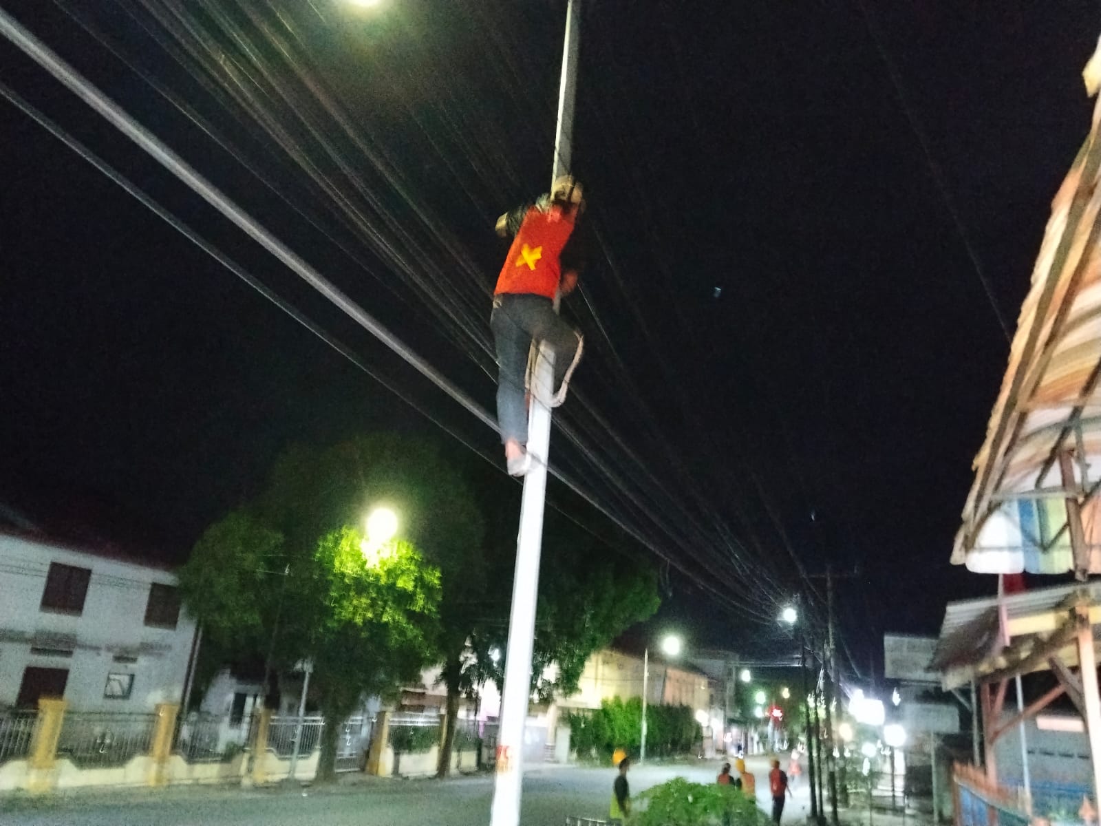 Pekerjaan dilakukan sekira lima pekerja dengan peran yang sudah ditugaskan, ada yang memanjat dengan tiang bermodalkan tali dan sebagian lainnya menarik kabel untuk dipasangkan ke tiang besi.