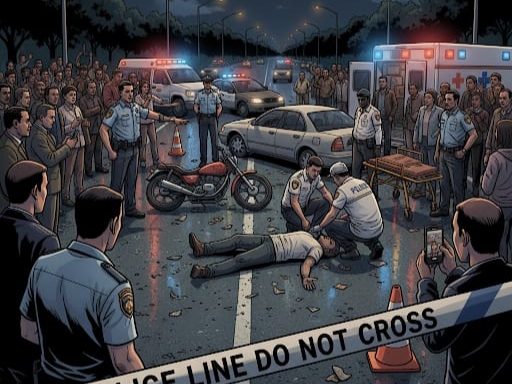Ia meninggal di lokasi setelah sepeda motor yang dikendarainya menabrak pembatas jalan dan tiang lampu.