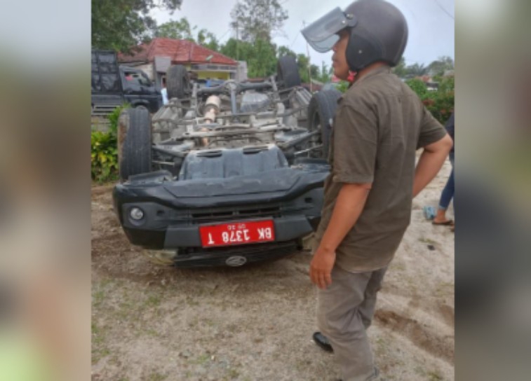 Persisnya, mobil dinas Sekretariat DPRD Simalungun itu terbalik di Raya Mas, Nagori (Desa) Raya Usang, Kecamatan Dolog Masagal, Kabupaten Simalungun, Sumatera Utara.