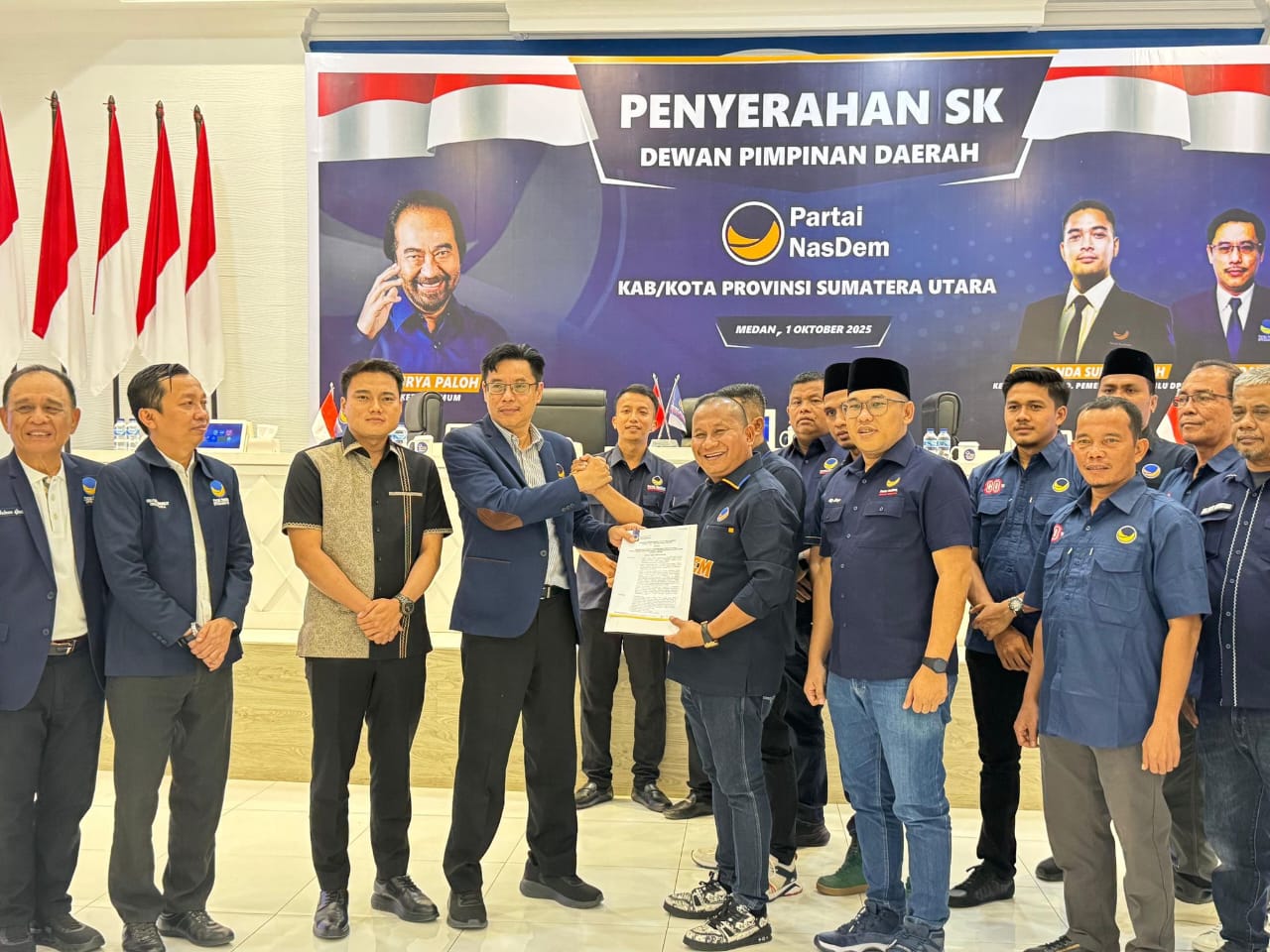 Medan, Sinata.id- Rahmansyah Sibarani,SH.,MH menerima Surat Keputusan (SK) sebagai Ketua DPD NasDem Kabupaten Tapanuli Tengah dari DPW NasDem Sumut, Selasa (14/10/2025).
