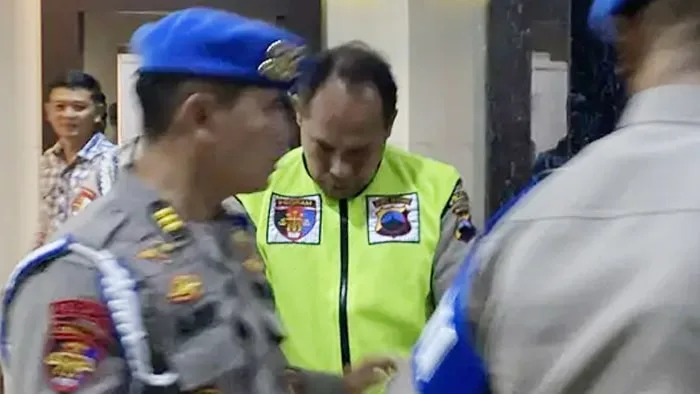 Kedua tangannya terikat kabel ties, dan ia dikawal ketat sejumlah anggota Propam yang berusaha menghalangi sorotan kamera jurnalis.
