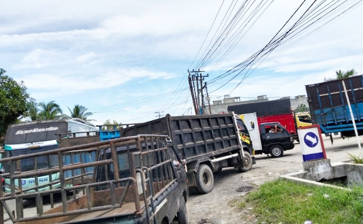Tampak antrian truk cukup panjang dan berlapis, sehingga menyebabkan Jalan Lintas Pematangsiantar-Asahan, macet. Diperkirakan, antrian truk mencapai 500 meter.