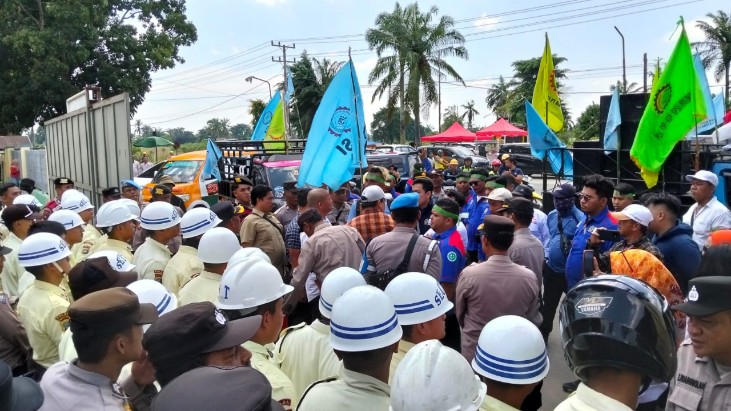 Sekira puluhan massa Federasi Serikat Pekerja Kimia Energi dan Pertambangan Serikat Pekerja Seluruh Indonesia (FSP KEP SPSI) Siantar-Simalungun beraksi di gebang masuk KEK Sei Mangke, Kabupaten Simalungun, Senin 27 Oktober 2025.