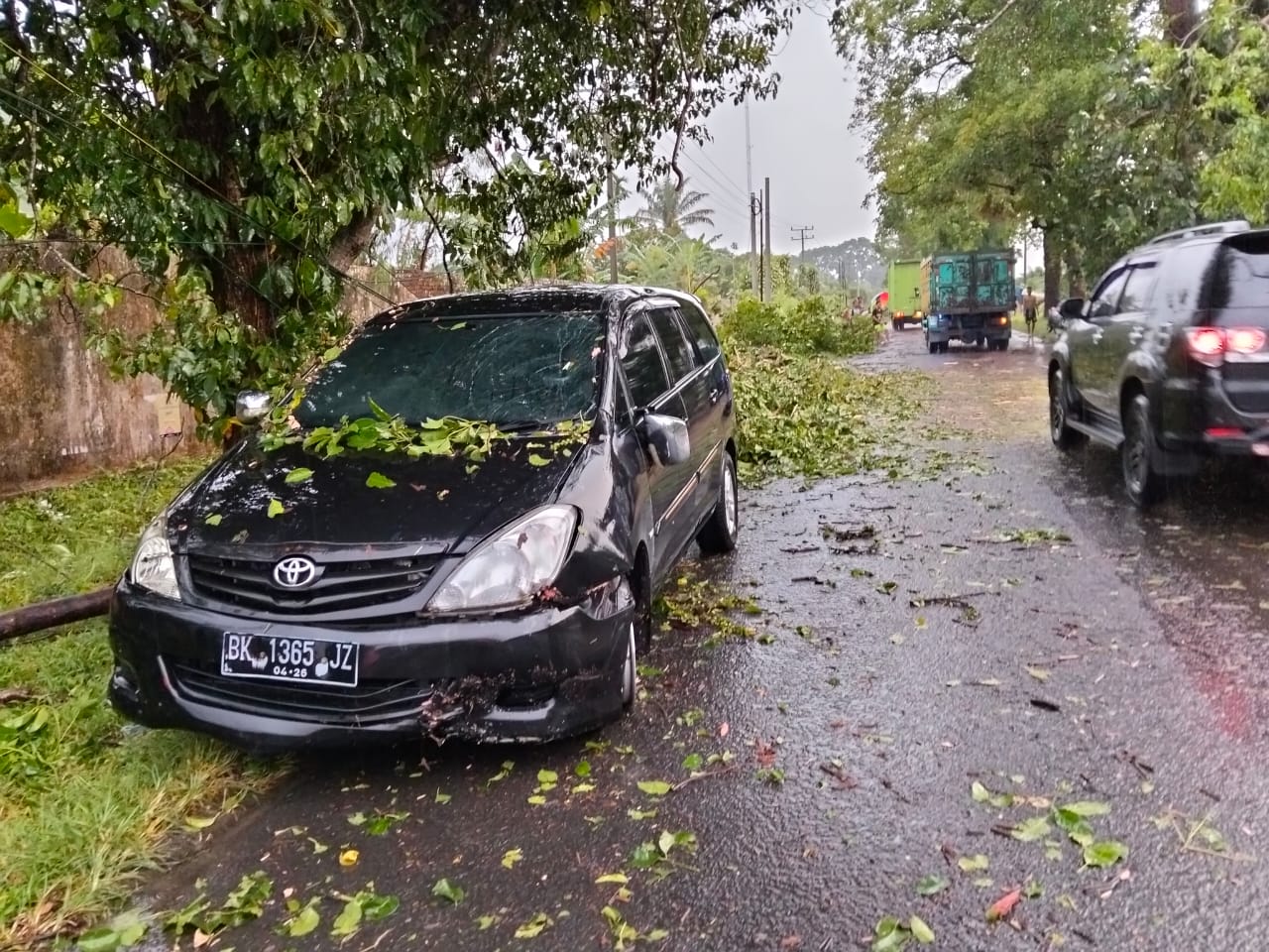 Sedangkan mobil Innova dengan nomor polisi BK 1365 JZ yang tertimpa cabang pohon terlihat mengalami kerusakan pada beberapa bagian, seperti kaca depan pecah, ban depan kiri pecah dan bodi mobil penyok. Kondisi ini membikin mobil tidak bisa jalan.